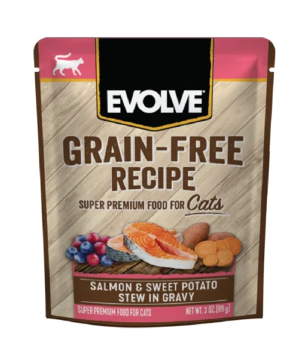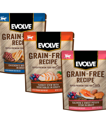 Los sobres Evolve Grain Free son diseñados para proporcionar una alta hidratación y nutrición de calidad, utilizando carne real (como Pollo o Salmón) en un jugoso gravy o caldo. Al ser libres de granos y de subproductos de aves de corral, ofrecen una opción digestible y sabrosa, ideal como alimento completo o como complemento nutritivo para las croquetas.